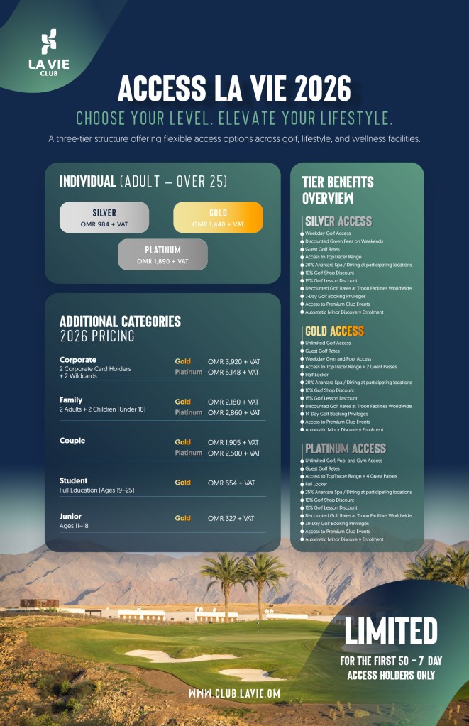 Nestled in Muscat’s vibrant Madinat Al Irfan district, LA VIE Club offers a world-class golf experience defined by its stunning championship layout, pristine course conditions, and warm hospitality. Designed by Paul Thomas, the 18-hole course flows through natural wadi terrain with dramatic elevation changes and breathtaking views of the Al Hajar Mountains and Sea of Oman. With expert turf care, Oman’s first TopTracer Range, and a state-of-the-art Golf Academy, every element is crafted to challenge, inspire, and welcome golfers of all levels—making LA VIE not just a course, but a destination.